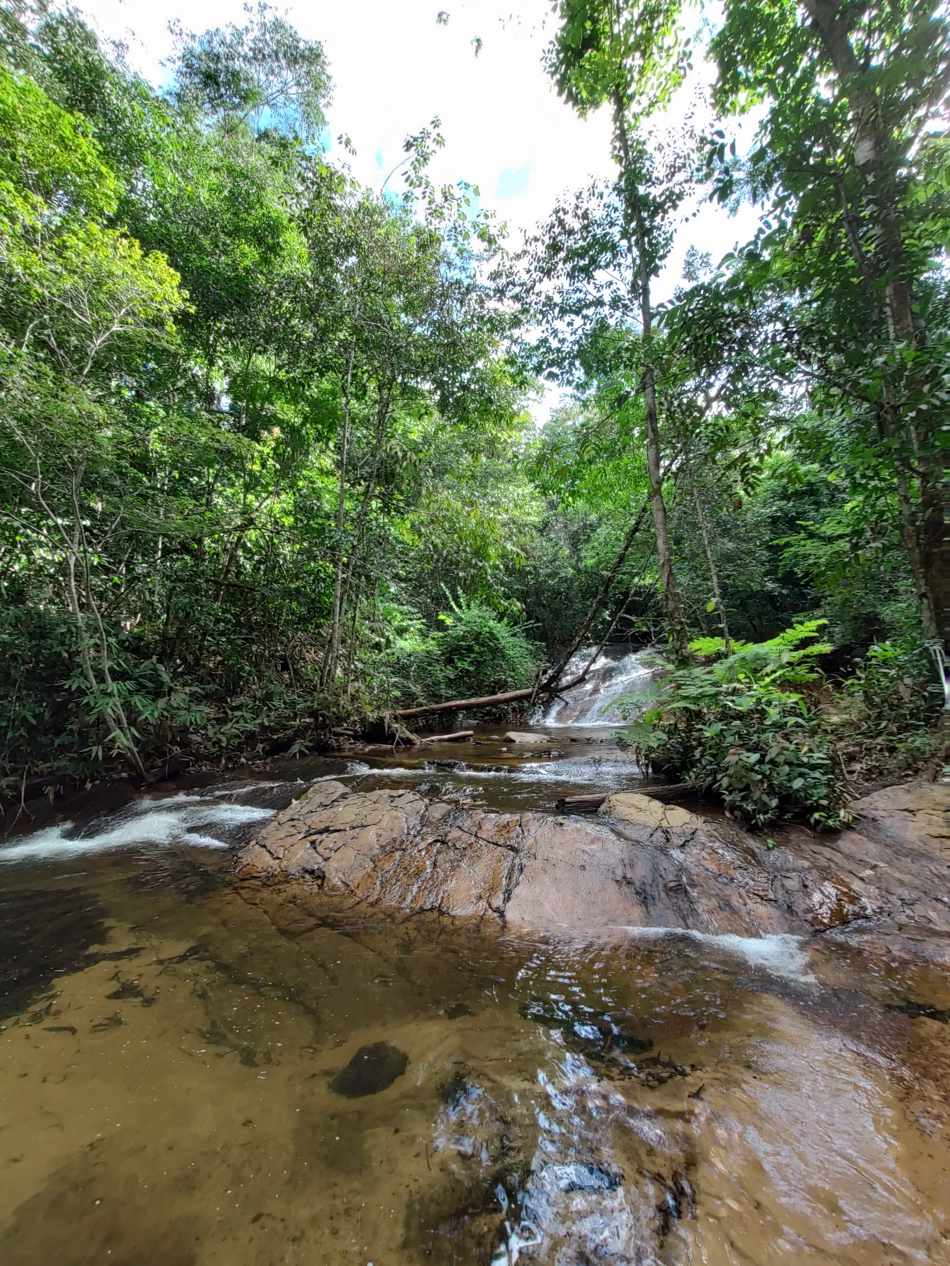 À medida que íamos nos aproximando do igarapé, o som das águas se fazia mais intenso e sabíamos que estávamos chegando ao final da trilha. A chegada tem suas recompensas e nos convidou a um banho na cachoeira. No momento em que chegamos no igarapé, o trabalho de marcação da trilha deu lugar a experiências de tocar e sentir água e tudo o que ela trazia. Tiramos as perneiras, as calças compridas, as camisas de campo e expusemos nossos corpos para um delicioso mergulho nas águas da cachoeira. A temperatura da água estava muito agradável o que fez com que eu entrasse de primeira. Clarice demorou um pouco mais pois, assim que ela colocou os pés, os peixes nadaram em direção a ela e começaram a mordiscar. Isso a afetou negativamente fazendo com que ela adiasse seu mergulho. Os peixes não me afetaram, nem me buscaram para mordiscar. Nem a mim nem à Luiza. Ela e eu nadamos com eles e fomos explorando as áreas de queda d’água e “pocinhas” para estar.