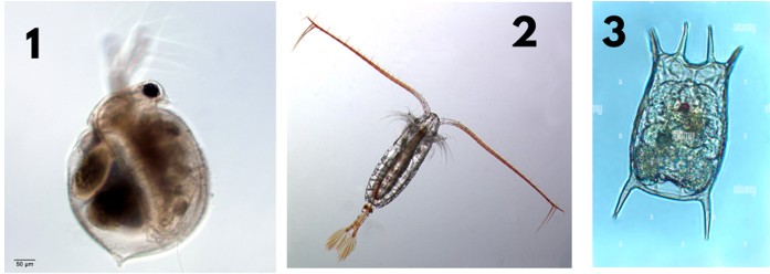 Dentro dos animais que constituem o zooplâncton de águas doces , destacam-se três grandes grupos: a ordem dos cladóceros, que têm corpo em forma de gota e nadam com movimentos curtos e rápidos. Também são conhecidos como pulgas-de-água; o filo dos rotíferos, a origem de seu nome vem do latim rota, que significa “roda”, em referência à coroa de cílios que circunda a boca (chamada de mástax) desses animais e se move rapidamente para capturar partículas de alimento, criando a aparência de uma micro roda gigante em movimento; e a subclasse dos copépodes, ágeis nadadores com longas antenas.